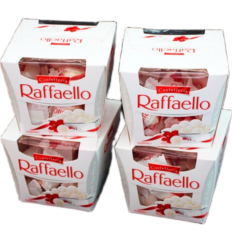 Четыре коробки конфет Raffaello с цельным орехом в кокосовой обсыпке по 150 грамм каждая. Суммарно 600 грамм конфет от Ferrero. Мы продаем только оригинальную продукцию, которую продем с минимальной наценкой, поэтому можем позволить себе участие в любых акциях. Будем рады Вашим заказам.